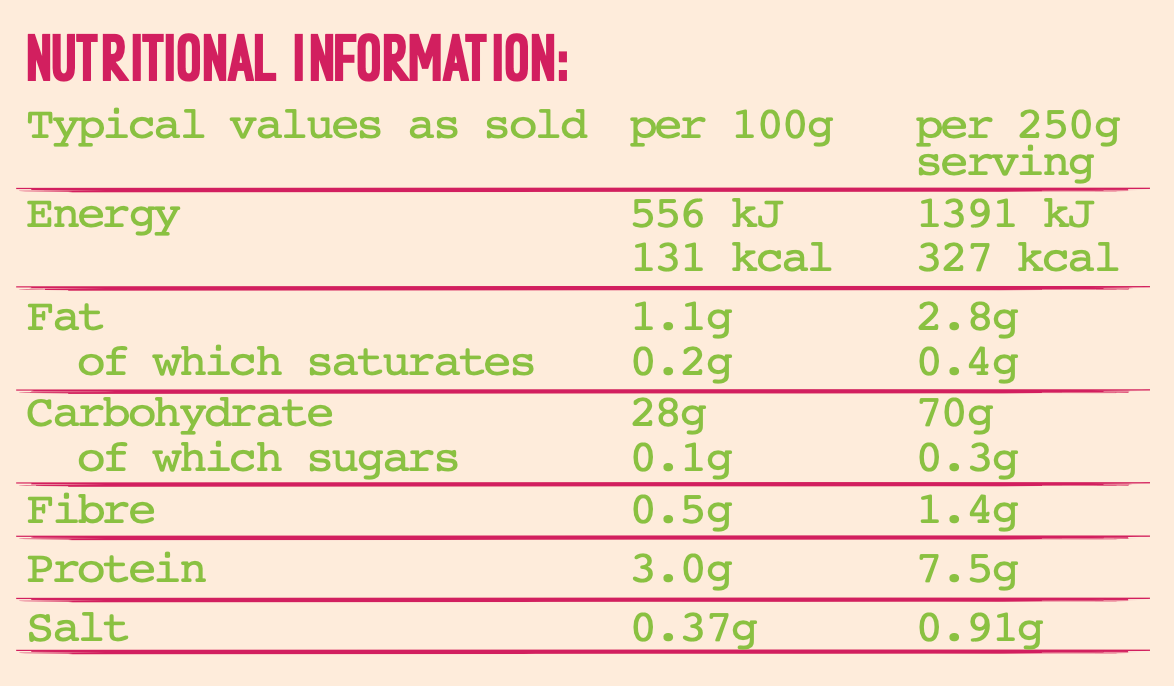 Ingredients: Water, Basmati Rice, Cumin Seeds, Sunflower Oil, Garlic Chilli Mix (Sunflower Oil, Garlic, Crushed Dried Red Chillies, Chilli Powder, Degi Mirch, Whole Dried Red Chilli), Salt, Green Cardamom.